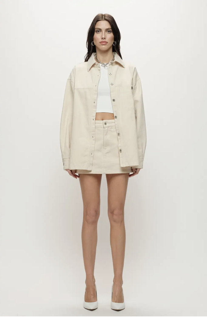 Beige loose fit denim overshirt featuring a single front pocket and contrast stitch details. Pair with loafers, socks and some cool shorts for an easy ‘about town’ look.